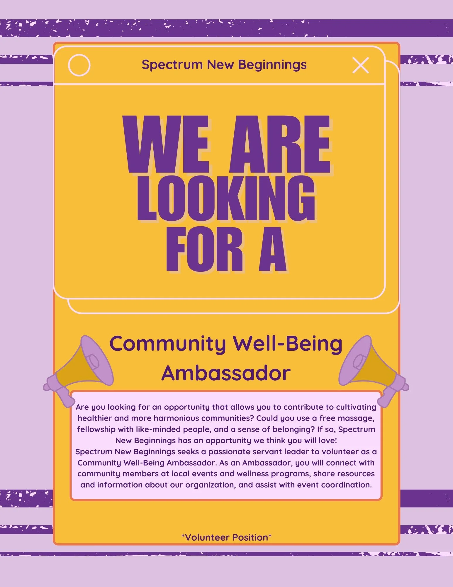 Spectrum New Beginnings seeks a passionate servant leader to volunteer as a Community Well-Being Ambassador. As an Ambassador, you will connect with community members at local events and wellness programs, share resources and information about our organization, and assist with event coordination.