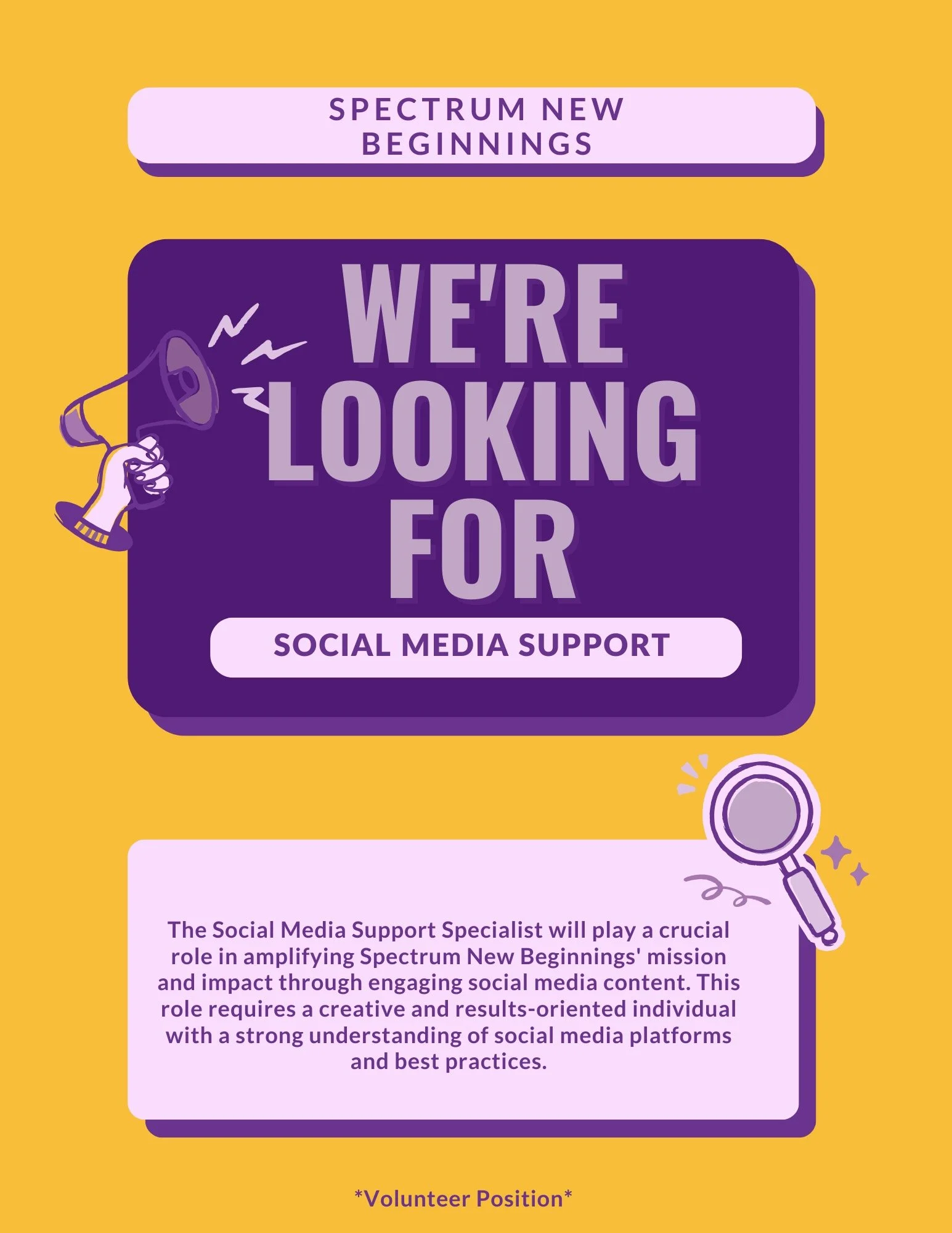 The Social Media Support Specialist will play a crucial role in amplifying Spectrum New Beginnings' mission and impact through engaging social media content. This role requires a creative and results-oriented individual with a strong understanding of social media platforms and best practices.